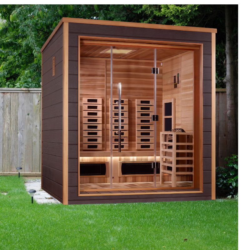 With the Golden Designs Visby 3-Person Hybrid Sauna, you get the flexibility of modern infrared technology and the charm of traditional heating in one stunning outdoor unit. Perfect for elevating your wellness journey!